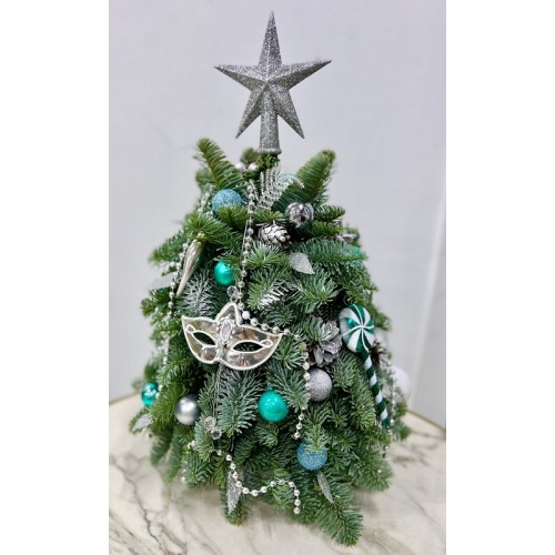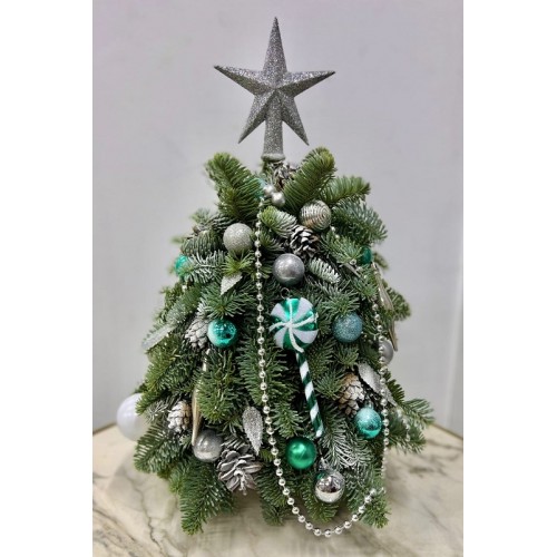 Новогодняя елка, украшенная новогодними елочными игрушками, бусами, шишками.
